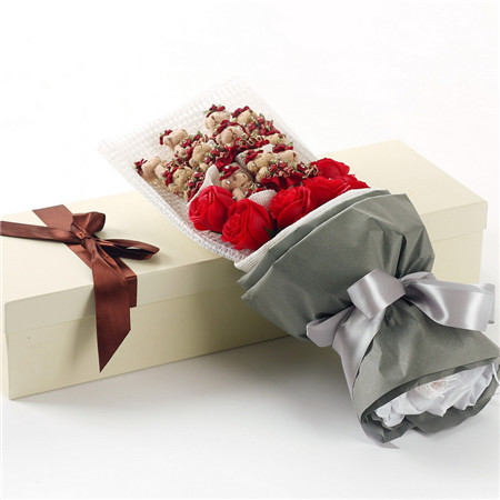 商品簡介:11支紅色小熊 7朵紅色香皂花 銀灰色包裝紙包裝 銀色蝴蝶結扎邊 高檔禮盒