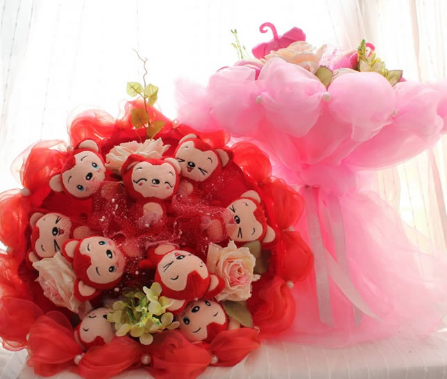 材料包裝: 10只阿貍,3朵玫瑰花,泡泡紗包裝。高45cm,直徑45cm左右 花 語:幸福生活