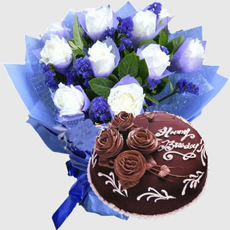 材料包裝: 「材  料」 鮮花:9枝白玫瑰,單枝包裝,內襯紫色勿忘我和綠葉。蛋糕(8寸):巧克力,鮮奶油,蛋糕底。頂部四朵玫瑰裝飾,做成圓形 「包  裝」 鮮花:深紫色皺紋紙包裝,同色蝴蝶結束扎成圓形花束 。蛋糕:高檔蛋糕禮盒包裝。免費送一次性蛋糕用品一套(刀、叉、盤、蠟燭)