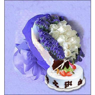 材料包裝: 「材  料」 鮮花:11枝白色玫瑰、紫色勿忘我圍邊豐滿。蛋糕(8寸):水果,鮮奶,巧克力 「包  裝」 鮮花:圓形包裝:白色棉紙內襯,紫色棉紙圓形包裝;紫色蝴蝶結緞帶 。蛋糕:高檔蛋糕禮盒包裝。免費送一次性蛋糕用品一套(刀、叉、盤、蠟燭)