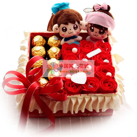 商品簡介:產品包含:15朵香皂花,10顆費列羅巧克力,一對娃娃。1朵蕾絲花。 禮盒尺寸:長19*寬119*高8.5CM