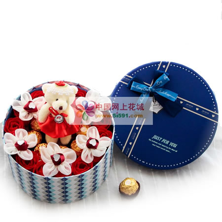 商品簡介:產品包含:15朵香皂花,9顆費列羅巧克力,一只婚禮熊。 禮盒尺寸:直徑20*高12CM