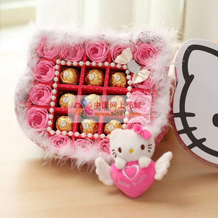 材料包裝: 產品包含:14朵香皂花,9顆費列羅巧克力,一只天使KT貓公仔 禮盒尺寸:長22*27CM