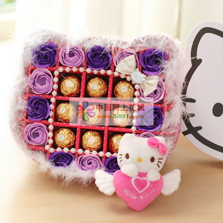 材料包裝: 產(chǎn)品包含:14朵香皂花,9顆費(fèi)列羅巧克力,一只天使KT貓公仔 禮盒尺寸:長22*27CM