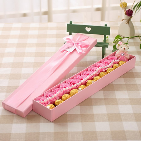 材料包裝: 產(chǎn)品包含:11朵香皂花,11顆費列羅巧克力 禮盒尺寸:長44*寬8.5*高4.5CM