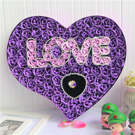 材料包裝: 香皂花:紫色,100朵love+戒指香皂花禮盒;尺寸:約40.5*36*4.8CM