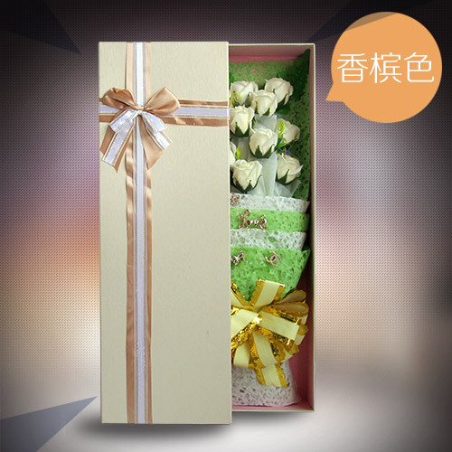材料包裝: 11朵香檳色香皂花禮盒,香檳色禮盒包裝。