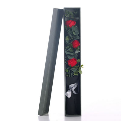 材料包裝: 產(chǎn)品簡稱:3朵紅色香皂花長條盒花束,尺寸:尺寸:65*10*8CM