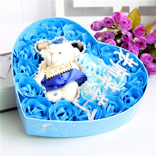商品簡介:18朵藍色香皂花禮盒老師辛苦了+小熊心形禮盒 18朵;長20.5*寬18.5*高4.5CM;;