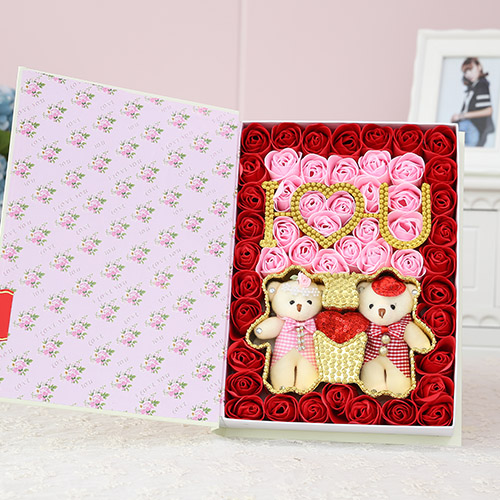 商品簡介:香皂花:51朵書本IU+牽手熊 紅色禮盒