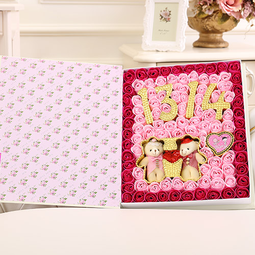 材料包裝: 香皂花:99朵書本1314+牽手熊 玫紅色禮盒