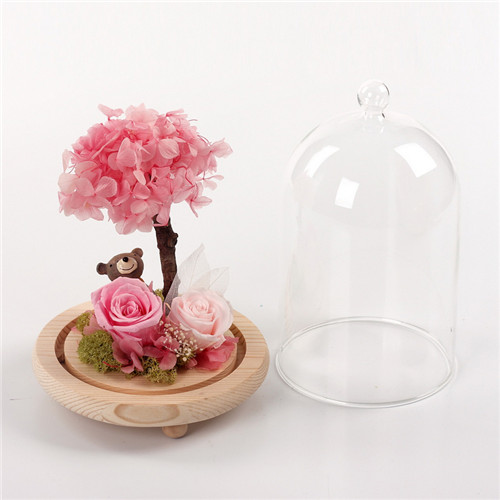 材料包裝: 主材:1朵5-6CM玫瑰,1朵3-4CM玫瑰。 配材:1只樹脂熊,繡球,苔蘚,葉脈。 尺寸:玻璃罩,直徑14CM,高20CM