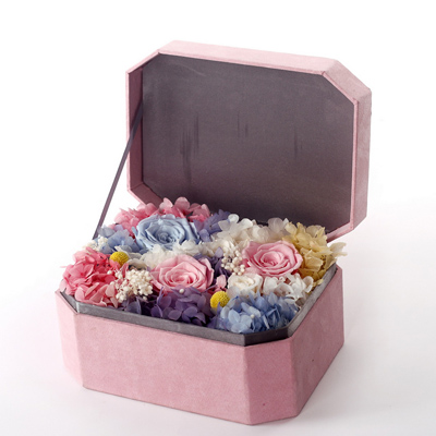材料包裝: 主材:3朵5-6CM進口玫瑰,2朵3-4CM玫瑰。配材:繡球,黃金球,米花等。尺寸:長方八角鹿皮絨禮盒23×17×12。贈送禮品袋