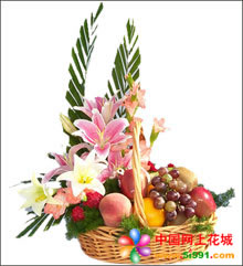 材料包裝: [材 料] 粉色香水百合4朵,白色鐵炮百合2枝,紅色康乃馨6枝,粉色劍蘭2枝,蓬萊松適量,散尾葵葉搭配,香橙2個(gè),鮮桃2個(gè),葡萄1串,蘋(píng)果2個(gè),獼猴桃2個(gè),香蕉2枝等時(shí)令水果 [包 裝] 35×25×15(長(zhǎng)寬高 厘米)藤編籃有柄花籃盛放