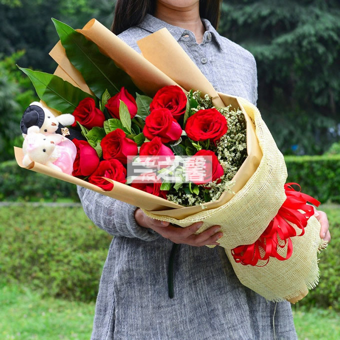 材料包裝: 11支紅色玫瑰+2支小熊,精品網(wǎng)紗包裝