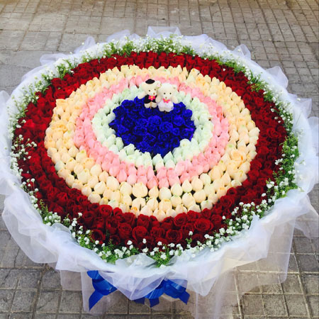 材料包裝: 999支紅,香檳,粉,白,藍色妖姬混搭,2只小熊,滿天星黃鶯搭配,白色紗網(wǎng)圓形包裝,藍色蝴蝶結扎尾