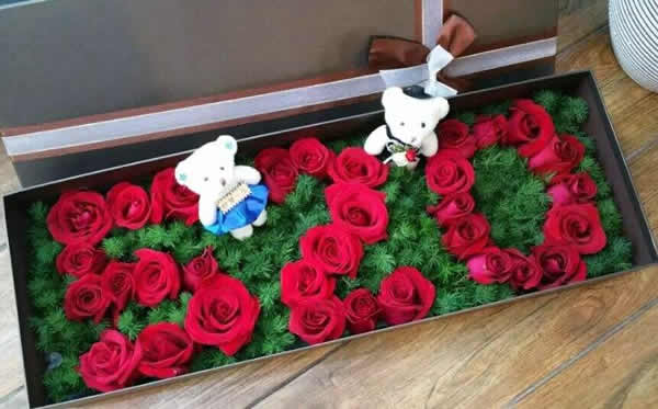 商品簡(jiǎn)介:33只紅玫瑰2只小熊,520造型高檔禮盒花
