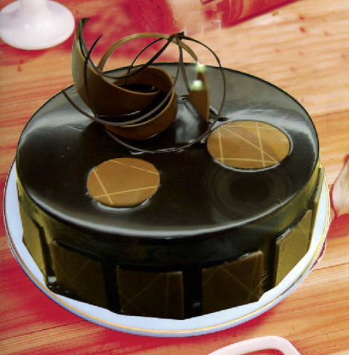 商品簡介:巧克力蛋糕,表面豐滿巧克力醬,外圍一圈巧克力片。簡單而不失色。