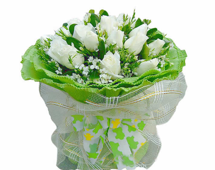 材料包裝: 16支白玫瑰加綠葉滿天星搭配圓形包裝 綠色卷邊紙包裝,外加白色網(wǎng)紗 同色系蝴蝶結(jié)