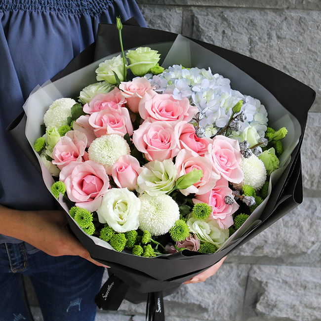 材料包裝: 11支粉色玫瑰加9支洋桔梗加乒乓菊3個加2個繡球,配草若干,高檔包裝