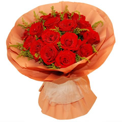 商品簡介:紅玫瑰20朵,配草豐滿,橙色包裝紙圓形包裝,白紗束扎