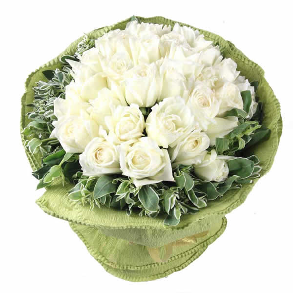 商品簡介:白玫瑰20,初雪草,綠色白裝紙,外部圍裹,絲帶束扎