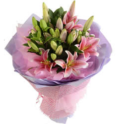 材料包裝: 【寶貝花材】:精選10枝粉色多頭香水百合 內(nèi)襯粉色棉紙,絕對保證花材新鮮,不新鮮全額退款。 【寶貝包裝】:精美圓型包裝,花束螺旋式束扎,淡藍(lán)色皺紋紙角邊包裝 外圍編制網(wǎng) 配粉色細(xì)紗蝴蝶結(jié)。
