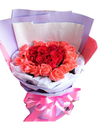 材料包裝: 紅玫瑰13枝 粉玫瑰14枝 梔子葉 商品包裝:里面白色棉紙,外面紫色及粉色皺紋紙港式包裝送花