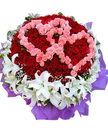 商品簡介:紅玫瑰144枝 粉玫瑰56枝 白色多頭百合11枝 黃鶯 滿天星 商品包裝:內襯淡色棉紙,外層墨綠色皺紋紙圓形包裝