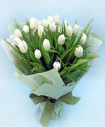 商品簡介:白色郁金香22枝 排草 商品包裝:淡綠色包裝紙,緞帶裹扎