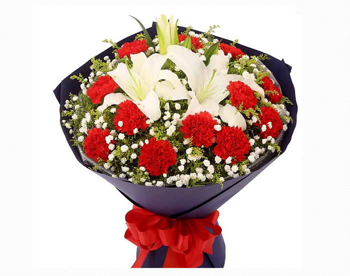 商品簡(jiǎn)介:材料:19朵紅色康乃馨2枝多頭白百合,黃鶯間插,滿天星點(diǎn)綴,包裝:內(nèi)襯英文霧面紙,外層黑色牛皮紙圓形包裝,紅色緞帶束扎