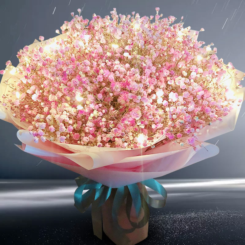 材料包裝: 2扎粉色滿天星,燈帶一只,粉色高檔包裝紙.