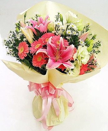 商品簡介:扶郎10枝 粉色多頭百合2枝 黃鶯 商品包裝:皺紋紙港式包裝