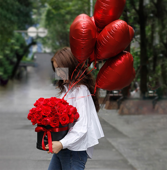 材料包裝: 材料52朵紅玫瑰,5顆紅色心形氣球裝飾。包裝精美黑色抱抱桶,紅色緞帶蝴蝶結裝飾。