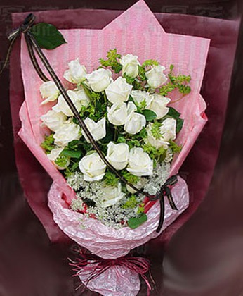 商品簡介:白玫瑰22枝 時(shí)尚配花 綠葉 商品包裝:皺紋紙扇形包裝