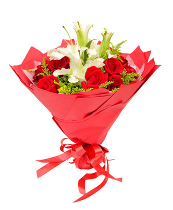 商品簡介:紅玫瑰11枝 白色多頭百合2枝 商品包裝:內襯棉紙,多層紅色皺紋紙包裝,紅色絲帶束扎