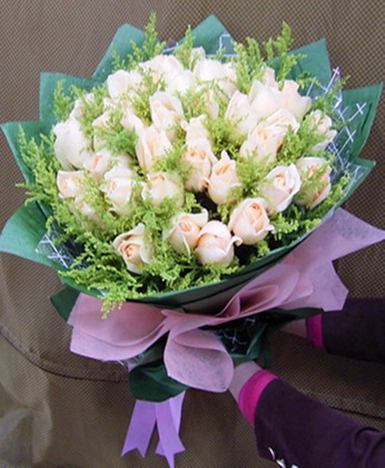 商品簡介:香檳玫瑰33枝 黃鶯 商品包裝:皺紋紙圓形包裝