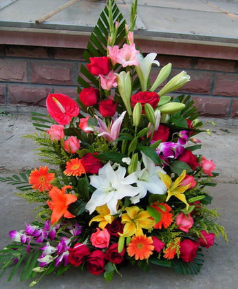 商品簡介:扶郎 紅玫瑰 白色多頭百合 粉色多頭百合 黃色多頭百合 紫色洋蘭 劍蘭 黃鶯 散尾葉 商品包裝:精美花籃