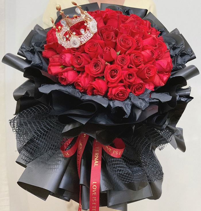 商品簡介:材料:99支精品紅玫瑰,一個皇冠裝飾包裝:黑色手揉紙+黑色硬紙+黑色硬網紗,紅色英文緞帶束扎