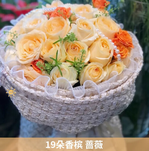 商品簡介:19朵香檳玫瑰、5朵薔薇(或者5朵粉玫瑰),小香風包裝。