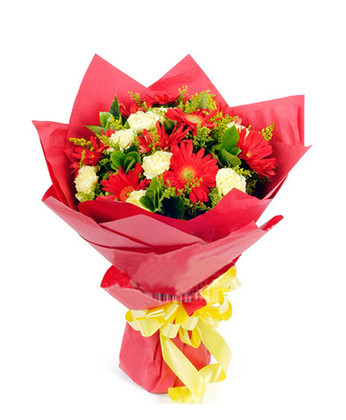 商品簡介:紅色扶郎9枝、黃色康乃馨9枝,黃鶯間插 商品包裝:紅色手揉紙圓形包裝
