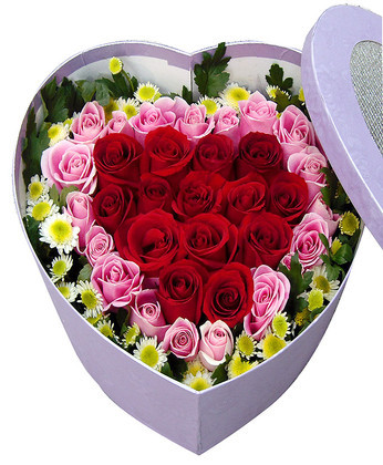 商品簡介:紅玫瑰11枝 粉玫瑰22枝 迷你菊 梔子葉 (或用其它時令配花) 商品包裝:紫色心形禮盒