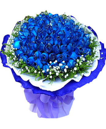 商品簡介:藍玫瑰99枝 黃鶯 滿天星 商品包裝:高檔卷邊紙圓形包裝