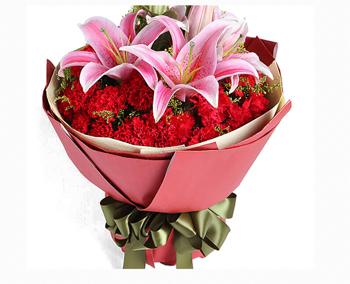 商品簡介:材料:29朵紅色康乃馨,多頭粉百合2枝,包裝:內(nèi)襯淡黃色牛皮紙,外層紅色牛皮紙圓形包裝,綠色緞帶束扎。