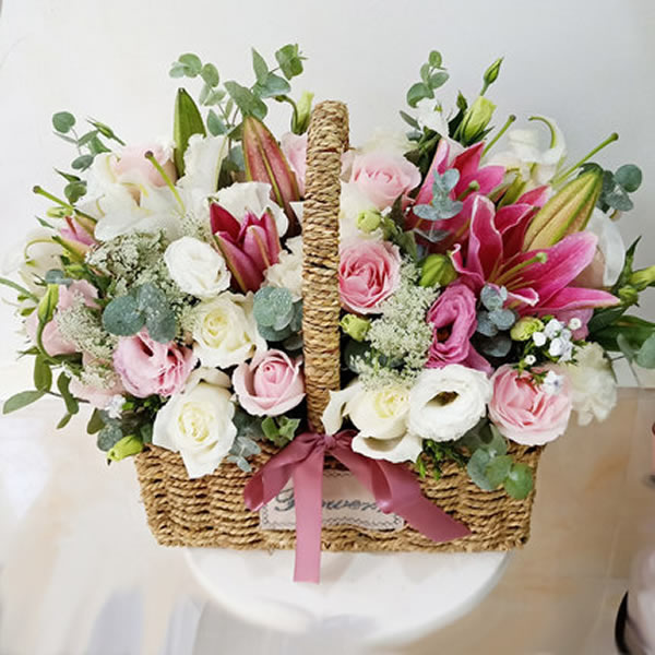 材料包裝: 粉玫瑰9枝白玫瑰9朵,白桔梗9朵,粉百合9朵,綠葉間插,滿點星點綴,商品包裝:手提籃子.