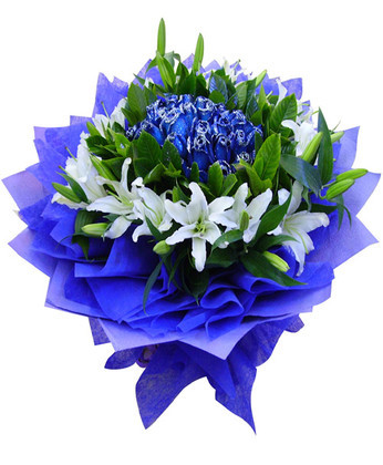商品簡介:藍(lán)玫瑰19枝 白色多頭百合10枝 梔子葉 商品包裝:里層藍(lán)色棉紙,外圍藍(lán)色皺紋紙圓形包裝