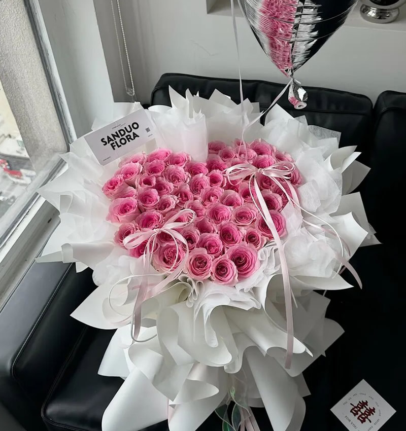 材料包裝: 66朵洛神粉玫瑰,心型包裝三層包裝,2個花結點綴,氣球一個。