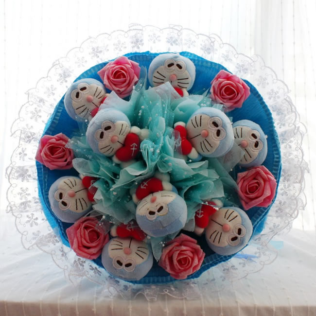 商品簡介:9只高10CM的機器貓,旁邊是6朵仿真花.高40cm,直徑40cm左右。花 語:愛情,在于不斷的驚喜
