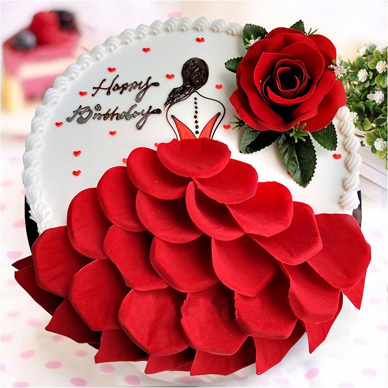 商品簡介:圓形鮮奶蛋糕,蛋糕中間夾有一層新鮮水果,表面再用玫瑰花瓣裝飾。
