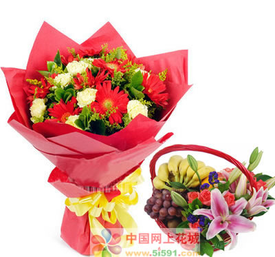 商品簡介:紅色扶郎9枝、黃色康乃馨9枝,黃鶯間插;果籃:3支粉香水百合+12支粉玫瑰+香蕉+橙子+提子+奇異果
